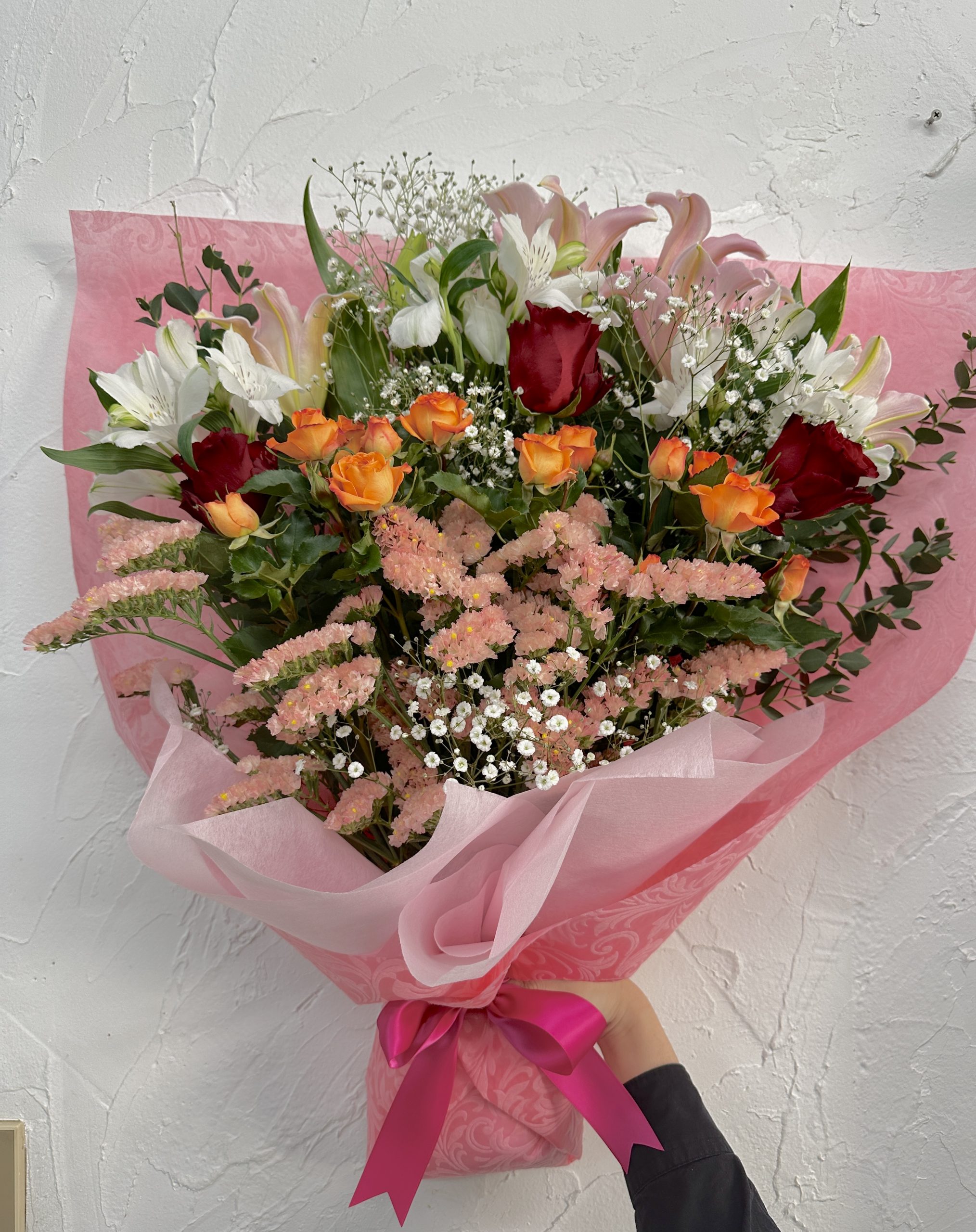 百合、アルストロメリア、バラ、ミニバラ、スターチス、かすみ草が